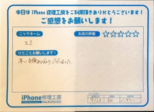 エミ様、この度は当店をご利用頂き誠にありがとうございました。