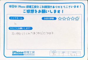【iPhone7の画面修理でお越しのk様からいただいた評価】