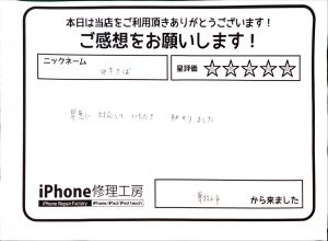 【iPhone 6Sの画面修理でお越しのゆきさば様からいただいた評価】