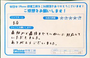 【iPhone 6Sのパネル交換でお越しのみね様からいただいたお声】