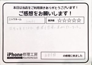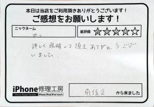 【iPhone 6Sのパネル交換でお越しのみね様からいただいた評価】