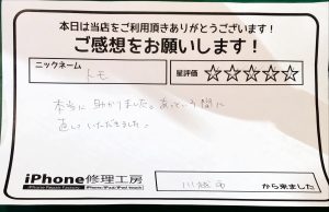 【iPhoneの画面修理でお越しのトモ様からいただいた評価】