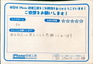 iPhoneXのバッテリー交換でお越しのタカ様からの評価