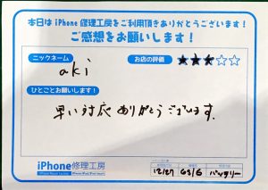 【iPhone6Sのバッテリー修理でお越しのaki様からいただいた声】