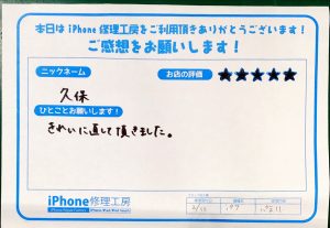 〜iPhone7の画面交換でお越しの久保様から頂いた評価〜