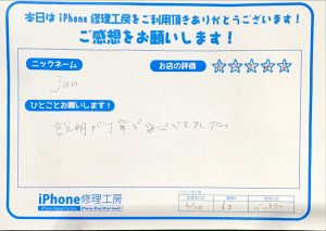 〜iPhone6Sのバッテリー交換でお越しのjun様から頂いた評価〜