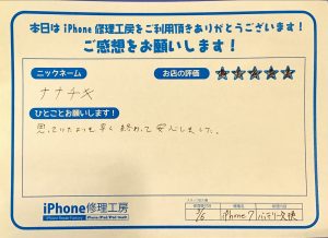【iPhone7のバッテリー交換修理でお越しのナナチキ様からいただいた評価】