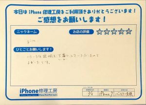 本日はiPhone7のバッテリー交換でお越しのお客様の口コミを紹介します。