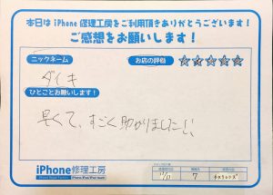 〜iPhone7のカメラ交換でお越しのダイキ様から頂いた評価〜