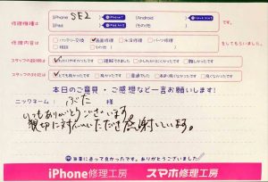 【iPhoneSEのバッテリー交換でお越しのこういちろう様へのスタッフのコメント】