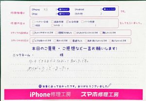 【iPhoneXSの画面交換でお越しのスズキ様へのスタッフのコメント】