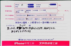 本日はiPhone11の画面交換でお越しのお客様からいただいたお声をご紹介します^^