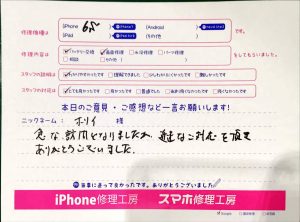 【iPhone6Sのバッテリーと画面の同時修理でお越しのホリイ様から頂いた口コミ】