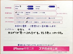本日はiPhone7のバッテリー交換でお越しのお客様から頂いた口コミを紹介します。