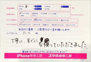 本日はiPhone8のバッテリー交換でお越しのたつ様からいただいた口コミをご紹介させていただきます^ ^