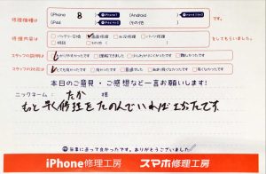 本日はiPhone8の画面交換でお越しのたか様からいただいた口コミをご紹介させていただきます^ ^