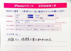 本日はiPod touch6のバッテリー交換でお越しのお客様からいただいたお声をご紹介します!!