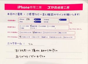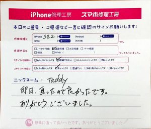 【iPhoneSE2の画面交換でお越しのtaddy様から頂いた口コミ】
