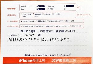 【iPhone11の画面交換でお越しのイナガキ様からいただいた口コミ】