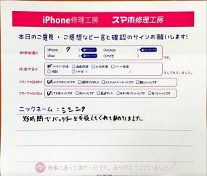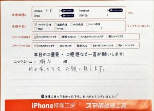 【iPhone6Plusのバッテリー交換でお越しの瀬奈様へのスタッフのコメント】