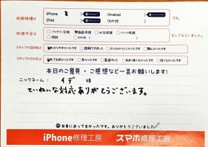 【iPhone8のバッテリー交換でお越しのイデ様から頂いた口コミ】