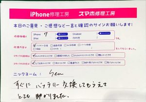 本日はiPhone7のバッテリー交換でお越しのSeu様から頂いた口コミをご紹介いたします。