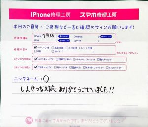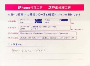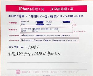 【iPhone7の画面交換でお越しのしのぶ様へのスタッフのコメント】