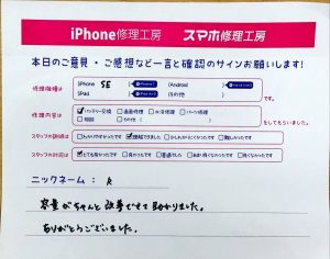 iPhone修理工房秋津店 / iPhoneSEのバッテリー交換でお越しのお客様から頂いた口コミ