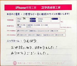 【iPhoneSEのバッテリー交換でお越しのりえぼう様から頂いた口コミ】