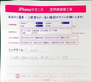 【iPhoneXのバッテリー交換でお越しのはんぞう様から頂いた口コミ】