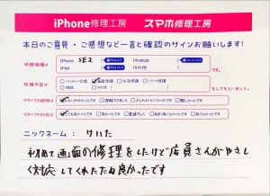 本日はiPhoneSE2の画面交換でお越しのけいた様から頂いた口コミを紹介致します。