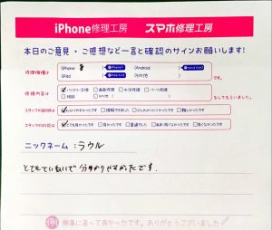 【iPhone8のバッテリー交換でお越しのラウル様から頂いた口コミ】