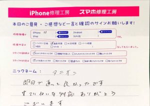 本日はiPhone11の画面交換でお越しのタニオン様から頂いた口コミをご紹介致します。