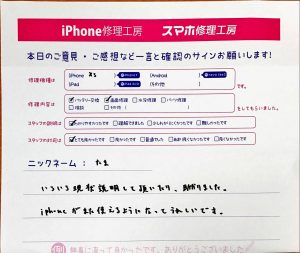 【iPhoneXSの画面交換でお越しのたま様へのスタッフのコメント】