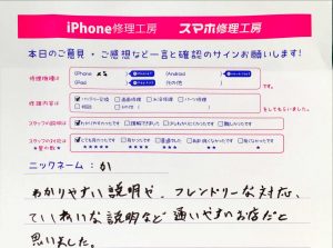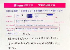 本日はiPhone7のバッテリー交換でお越しのお客様から頂いた口コミをご紹介致します。