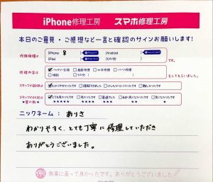 【iPhone8のバッテリー交換でお越しのありさ様へのスタッフのコメント】