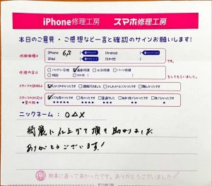 【iPhone6Sの画面交換でお越しの〇△×様へのスタッフのコメント】