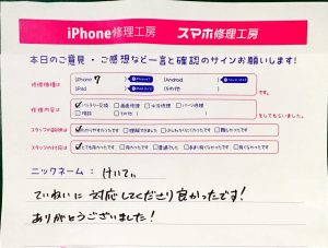 本日はiPhone7のバッテリー交換でお越しのお客様から頂いた口コミをご紹介します。