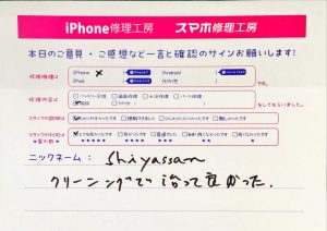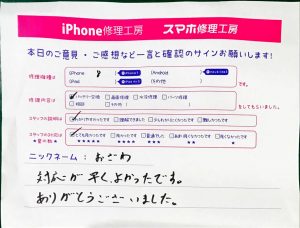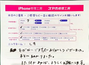 本日はiPhone7のバッテリー交換でお越しのお客様から頂いた口コミをご紹介致します。