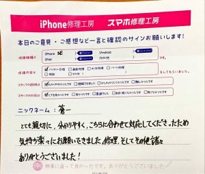 【iPhoneSEのバッテリー交換でお越しの蒼一様から頂いた口コミ】