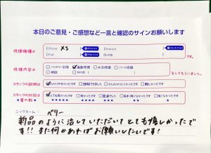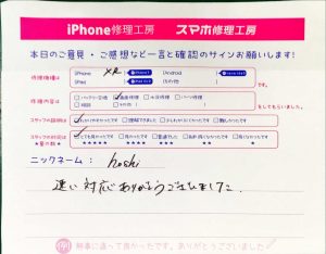 【iPhoneXRの画面交換でお越しのhoshi様へのスタッフのコメント】