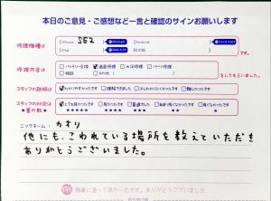【iPhoneSE2の画面交換でお越しのカオリ様へのスタッフのコメント】