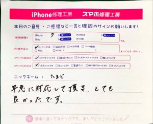 【iPhone7のバッテリー交換でお越しのたまで様から頂いた口コミ】