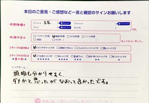 【iPhone SEの画面修理でお越しのお客様へのスタッフのコメント】