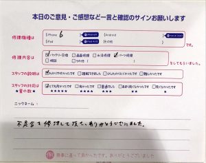 スマホ修理工房秋津店/iPhone6のバッテリー交換とパーツ修理のお客様から頂いた口コミ