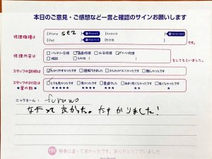 【iPhoneSE2の画面修理でお越しのfurawo様へのスタッフのコメント】