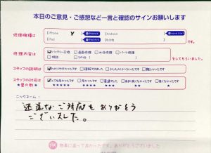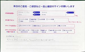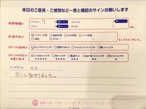 本日はiPhone7のバッテリー交換でお越しのお客様から頂いた口コミを紹介致します。