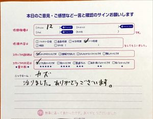 【iPhone12のパーツ交換でお越しのカズ様へのスタッフのコメント】