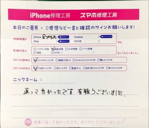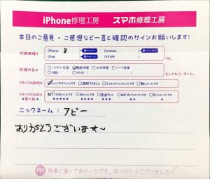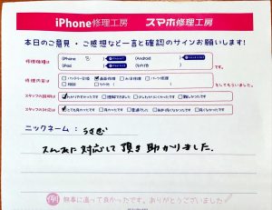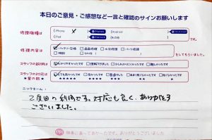 本日はiPhone6Sのバッテリー交換でお越しのお客様から頂いた口コミをご紹介致します。