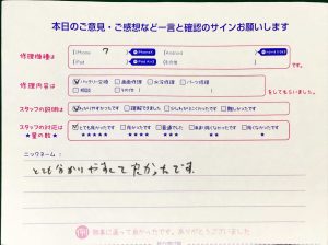 本日はiPhone 7のバッテリー交換でお越しのお客様から頂いた口コミをご紹介致します。